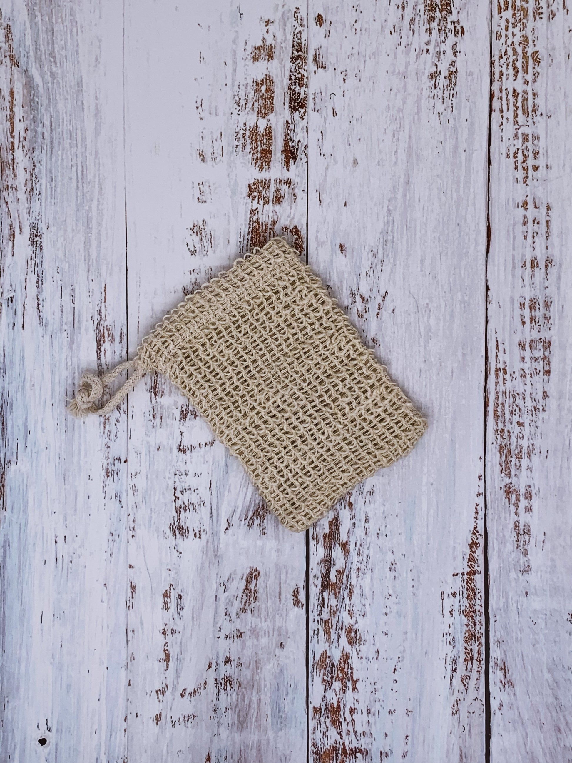 A sisal soap bag with drawstring top.